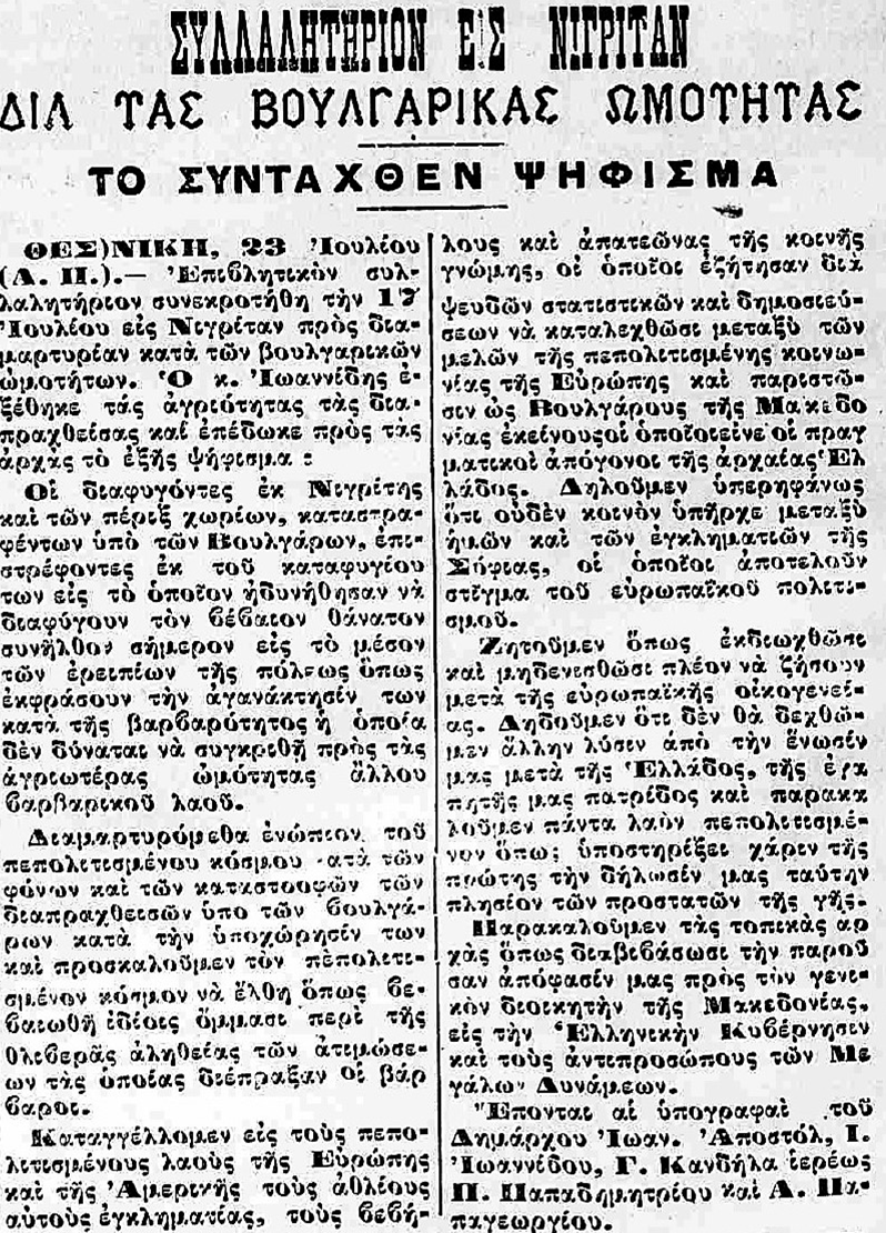 Το πλήρες κείμενο της εφημερίδα έχει ως εξής: «ΘΕΣΣΑΛΟΝΙΚΗ, 23 Ιουλίου (A. Π.). Επιβλητικόν συλλαλητήριον συνεκροτήθη την 17 Ιουλίου εις Νιγρίταν προς διαμαρτυρίαν κατά των βουλγαρικών ωμοτήτων. O κ. Ιωαννίδης εξέθηκε τας αγριότητας τας διαπραχθείσας και επέδωκε προς τας αρχάς το εξής ψήφισμα: