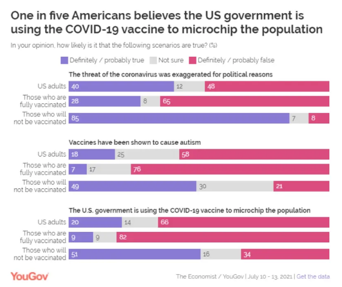 H έρευνα της YouGov και του περιοδικού «Εconomist» δείχνει ότι, περίπου το 20% των Αμερικανών πιστεύουν στη θεωρία συνωμοσίας ότι τα μικροτσίπ μπορεί να έχουν τοποθετηθεί στα ενέσιμα σκευάσματα κατά του κορωνοϊού. Παρά την έλλειψη αποδεικτικών στοιχείων για την υποστήριξη ενός τέτοιου ισχυρισμού, η δημοσκόπηση κατέληξε στο συμπέρασμα ότι, το 15% των Αμερικανών δηλώνει ότι αυτή η θεωρία συνωμοσίας είναι «πιθανόν αληθινή», ενώ ένα άλλο 5% θεωρεί ότι είναι «σίγουρα αληθινή» .