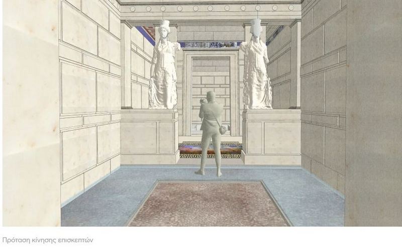 Στο εσωτερικό του μνημείου διαμορφώνονται υπερυψωμένα δάπεδα πρόσβασης με βαθμίδες, τα οποία οδηγούν στο γυάλινο δάπεδο, που θα καλύπτει το βοτσαλωτό του πρώτου χώρου. Στους επόμενους δύο χώρους θα κατασκευαστεί περιμετρικός διάδρομος με γυάλινο δάπεδο, τόσο για τη θέαση των Καρυάτιδων όσο και του ψηφιδωτού της «Αρπαγής της Περσεφόνης.