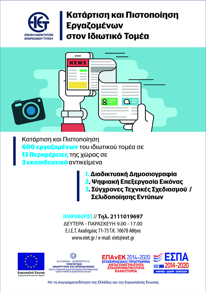 Σας ενημερώνουμε ότι συνεχίζονται οι εγγραφές στο Πρόγραμμα Κατάρτισης & Πιστοποίησης γνώσεων και δεξιοτήτων εργαζομένων στον ιδιωτικό τομέα που υλοποιεί η Ένωση Ιδιοκτητών Επαρχιακού Τύπου και μπορούν να εγγραφούν εργαζόμενοι -με κάθε σχέση εργασίας.