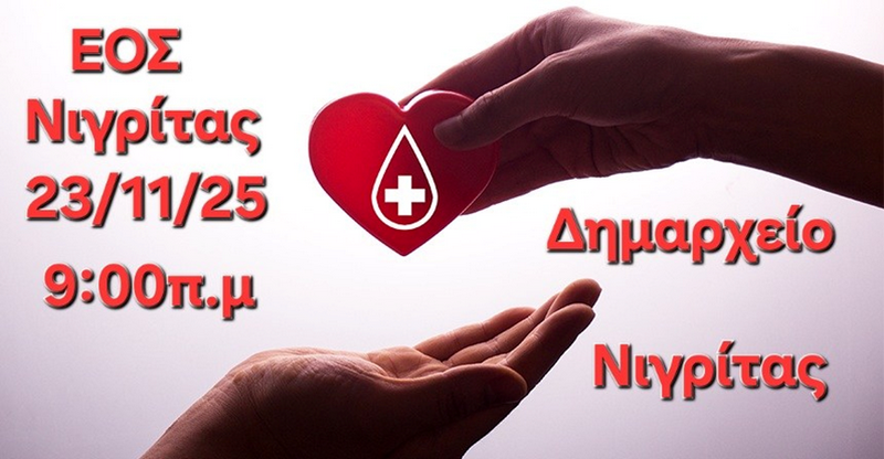 Ο Ορειβατικός Σύλλογος Νιγρίτας και το 3ο Δημοτικό Σχολείο Νιγρίτας διοργανώνουν κοινή εθελοντική αιμοδοσία την Κυριακή 23 Νοεμβρίου, στο Δημαρχείο Νιγρίτας, από τις 9:00 π.μ. έως τις 1:00 μ.μ.