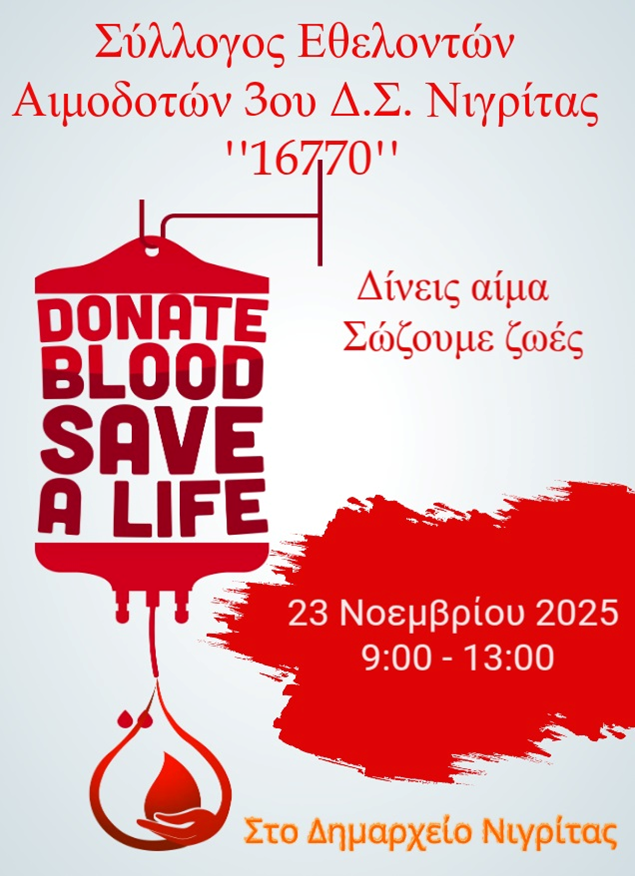 Ο Ορειβατικός Σύλλογος Νιγρίτας και το 3ο Δημοτικό Σχολείο Νιγρίτας διοργανώνουν κοινή εθελοντική αιμοδοσία την Κυριακή 23 Νοεμβρίου, στο Δημαρχείο Νιγρίτας, από τις 9:00 π.μ. έως τις 1:00 μ.μ.