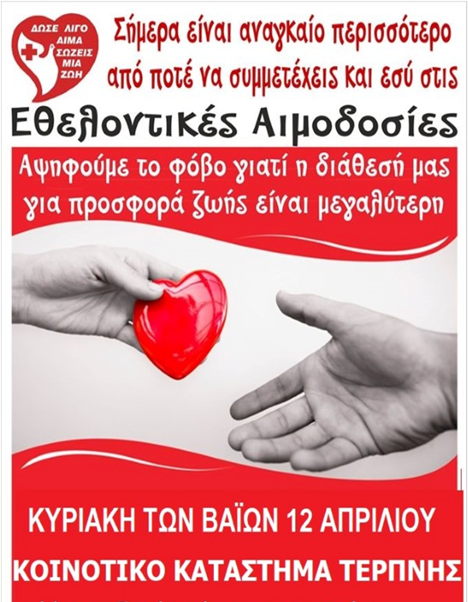 Ας διαθέσουμε ΟΛΟΙ λίγο από τον πολύτιμο χρόνο μας και ας τρέξουμε την Κυριακή 12 Απριλίου στην Τερπνή, προκειμένου να δώσουμε με το αίμα μας ΕΛΠΙΔΑ και ΖΩΗ στον συνάνθρωπό μας, στον συμπατριώτη μας.