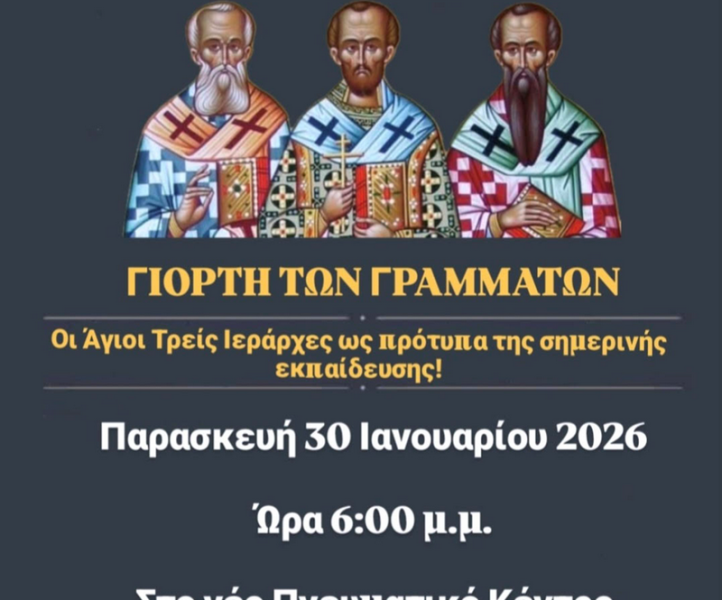 Ο Ιερός Ναός Αγίου Γεωργίου Νιγρίτας διοργανώνει εκδήλωση προς τιμήν των Αγίων Τριών Ιεραρχών Μεγάλου Βασιλείου, Γρηγορίου του Θεολόγου και Ιωάννου του Χρυσοστόμου στο Πνευματικό Κέντρο “Εστία Πνεύματος” την Παρασκευή 30 Ιανουαρίου 2026 στις 6 το απόγευμα.