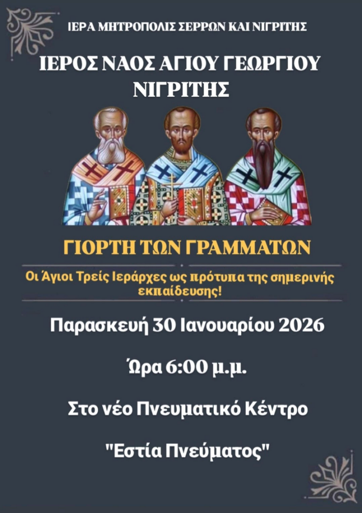 Ο Ιερός Ναός Αγίου Γεωργίου Νιγρίτας διοργανώνει εκδήλωση προς τιμήν των Αγίων Τριών Ιεραρχών Μεγάλου Βασιλείου, Γρηγορίου του Θεολόγου και Ιωάννου του Χρυσοστόμου στο Πνευματικό Κέντρο “Εστία Πνεύματος” την Παρασκευή 30 Ιανουαρίου 2026 στις 6 το απόγευμα.