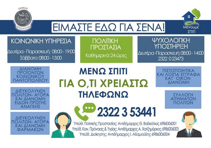 Σε αυτή τη μάχη, ο Δήμος Βισαλτίας είναι καθημερινά στην πρώτη γραμμή και σε συνέχεια των μέτρων που ήδη έχει πάρει, θέτει και πάλι σε εφαρμογή τις έκτακτες υπηρεσίες υποστήριξης των πολιτών στο πλαίσιο της πρωτοβουλίας «Είμαστε εδώ για σένα!».