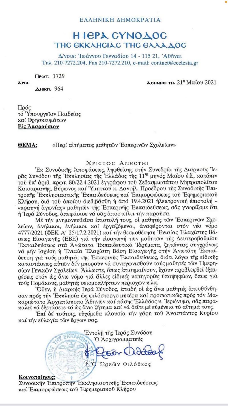 Η Ιερά Σύνοδος της Εκκλησίας Της Ελλάδος τάσσεται υπέρ του αιτήματος των μαθητών των Εσπερινών Λυκείων για τη μη εφαρμογή κοινής Ενιαίας Βάσης Εισαγωγής στην Τριτοβάθμια Εκπαίδευση για τους μαθητές των Εσπερινών και τους μαθητές των Ημερησίων Λυκείων