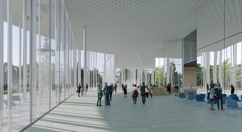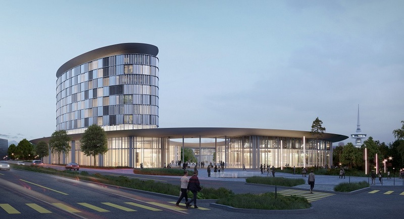 Ο κ. Sauerbruch πρόσθεσε πως πάνω από το πάρκο, οι Εκθεσιακοί Χώροι και το Συνεδριακό Κέντρο ξεχωρίζουν με τις χαρακτηριστικές προεξέχουσες στέγες τους που αιωρούνται σαν σύννεφα στο τοπίο.