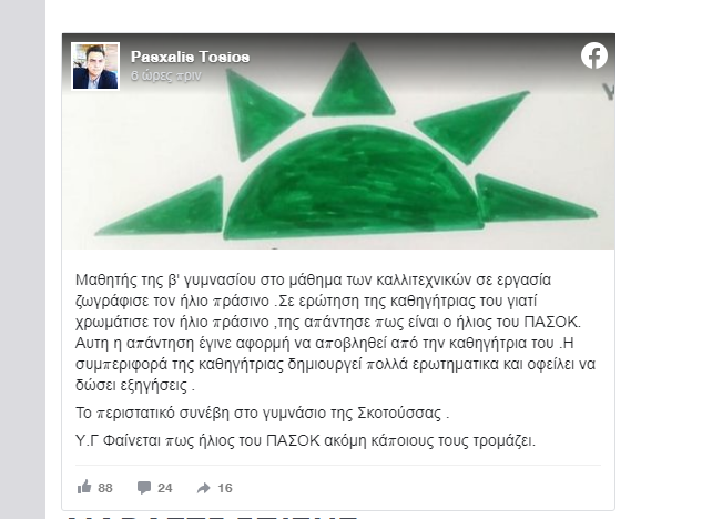 «Μαθητής της β’ γυμνασίου στο μάθημα των καλλιτεχνικών σε εργασία ζωγράφισε τον ήλιο πράσινο .Σε ερώτηση της καθηγήτριας του γιατί χρωμάτισε τον ήλιο πράσινο ,της απάντησε πως είναι ο ήλιος του ΠΑΣΟΚ. Αυτή η απάντηση έγινε αφορμή να αποβληθεί από την καθηγήτρια του .Η συμπεριφορά της καθηγήτριας δημιουργεί πολλά ερωτηματικά και οφείλει να δώσει εξηγήσεις .