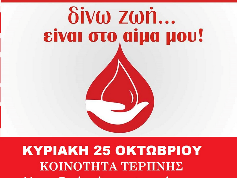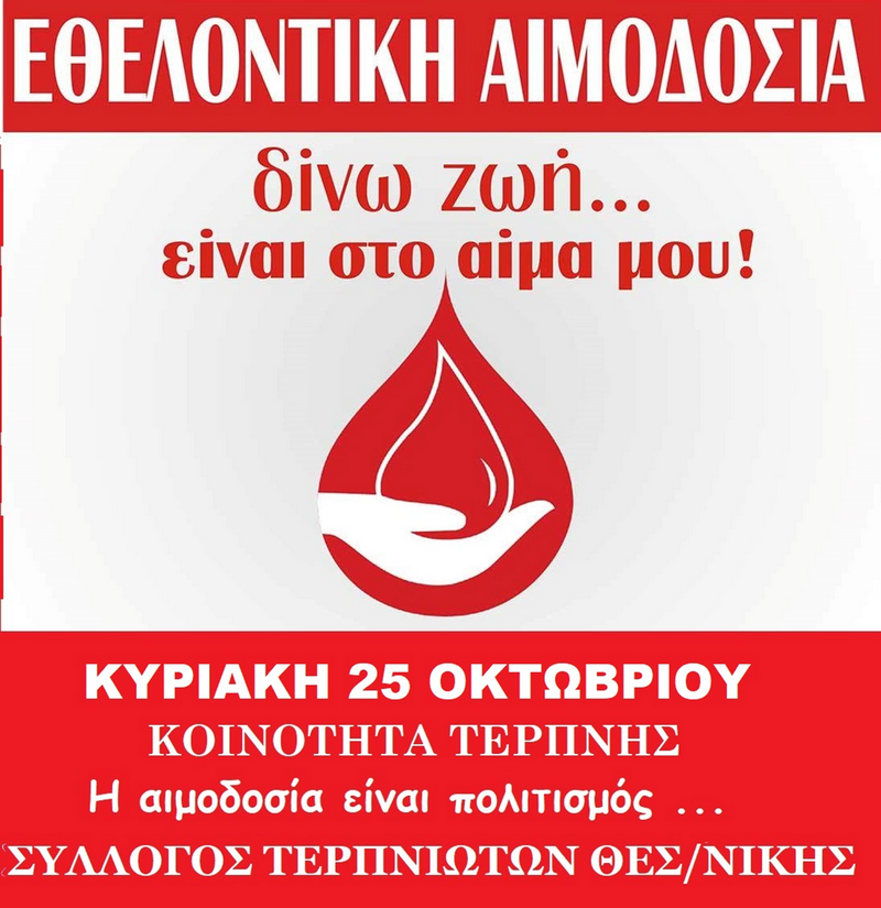 Ας διαθέσουμε ΟΛΟΙ λίγο από τον πολύτιμο χρόνο μας και ας τρέξουμε την Κυριακή 25 Οκτωβρίου στην Τερπνή, προκειμένου να δώσουμε με το αίμα μας ΕΛΠΙΔΑ και ΖΩΗ στον συνάνθρωπό μας, στον συμπατριώτη μας, ιδιαίτερα σήμερα που βιώνουμε δύσκολες στιγμές λόγω κορωνοιού και covid-19