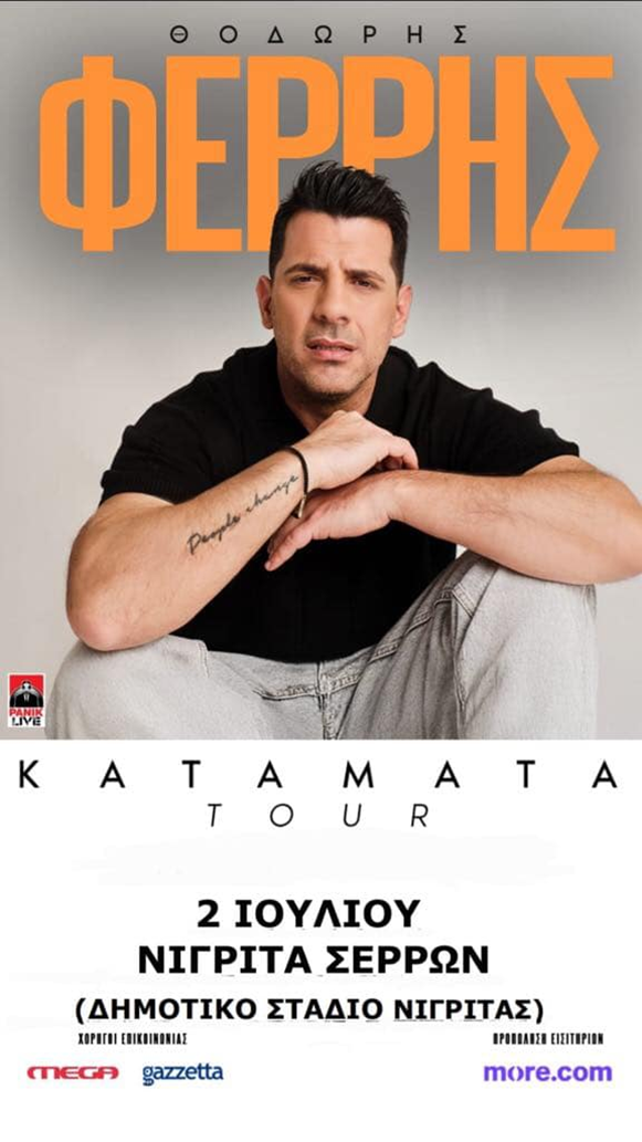 Η Νιγρίτα Σερρών ετοιμάζεται να υποδεχθεί τον Θοδωρή Φέρρη για μια μεγάλη συναυλία, την Τετάρτη 2 Ιουλίου 2025 με ώρα έναρξης: 20:30 Ο αγαπημένος ερμηνευτής θα εμφανιστεί στο Δημοτικό Στάδιο Νιγρίτας, χαρίζοντας στο κοινό μια βραδιά γεμάτη επιτυχίες, δυνατές ερμηνείες και πολλή διασκέδαση.