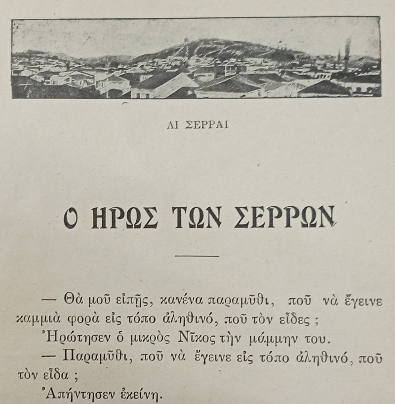 Φυσικά το ενδιαφέρον μας στράφηκε στο πρώτο διήγημα με τίτλο «Ο Ήρως των Σερρών». Πρόκειται για αναμνήσεις μιας Θεσσαλονικιάς γιαγιάς που ζούσε στην Αθήνα και είχε επισκεφθεί τα Σέρρας την περίοδο της τουρκοκρατίας, πριν την επανάσταση του 1821 (στον επίλογο μας πληροφορεί η αφηγήτρια ότι το γεγονός έγινε πριν 100 χρόνια). Ο τόπος της αφήγησης,  προσομοιάζει με μεγάλη ακρίβεια, με το χώρο των Σερρών στην περιοχή της εκκλησίας του Αγίου Παντελεήμονα, όπου διασώζονται υπολείμματα της γέφυρας υδραγωγείου οθωμανικής εποχής. Στο πάνω μέρος της σελίδας 7 του φυλλαδίου με την αρχή του αφηγήματος για τον Ήρωα των Σερρών, υπάρχει μικρή ασπρόμαυρη φωτογραφία της πόλης των Σερρών που είναι ταυτόσημη με την έγχρωμη φωτογραφία που δημοσιεύτηκε από τον Γιώργο Καφταντζή στο βιβλίο του «Ιστορία της πόλεως Σερρών και της περιφέρειας της» τ. Γ΄, Θεσσαλονίκη 1996.