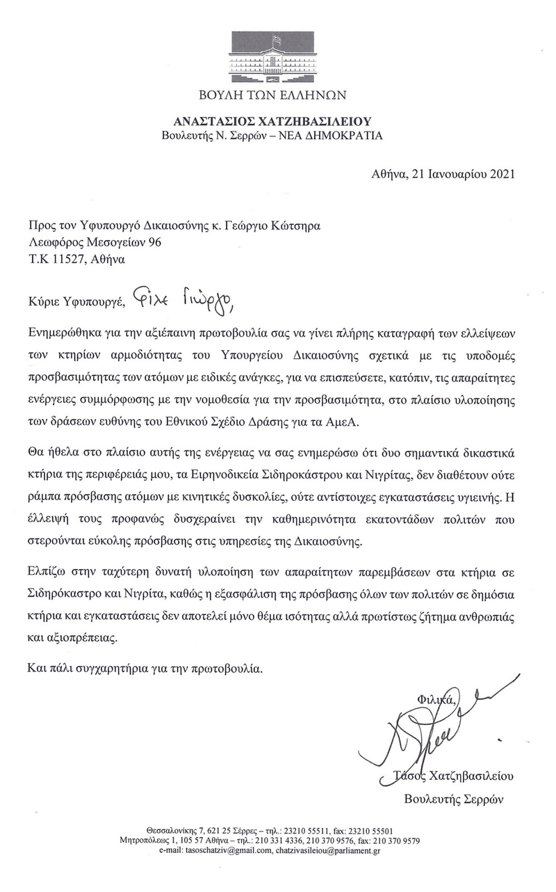 Παρέμβαση Τάσου Χατζηβασιλείου για την προσβασιμότητα ΑμεΑ και ηλικιωμένων στα Ειρηνοδικεία Νιγρίτας και Σιδηροκάστρου