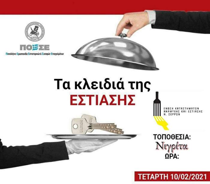Όλους τους συναδέλφους και συνεργάτες επαγγελματίες του χώρου της Εστίασης, την Τετάρτη 10 Φεβρουαρίου 2021, από τις 11.00 το πρωί μέχρι και τις 4.00 το απόγευμα, μπροστά από το κτήριο του Διοικητηρίου των Σερρών (πρώην Νομαρχία), όπου θα συλλέγονται τα κλειδιά των επιχειρήσεων και οι συνάδελφοι θα υπογράφουν τη σχετική «Δήλωση πρώην επαγγελματία Εστίασης» (Για τους συνεργάτες της εστίασης προβλέπονται ξεχωριστές δηλώσεις). Τα κλειδιά και η δήλωση θα μπαίνουν σε ένα φάκελο προς την Ομοσπονδία. Αντιπροσωπεία 99 συναδέλφων και ο πρόεδρος κάνοντας πορεία διαμαρτυρίας θα παραδώσουν το υλικό με ψήφισμα στο Μέγαρο Μαξίμου.