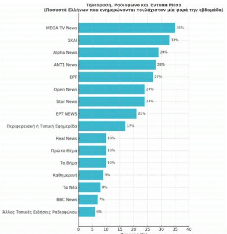 Συγκεκριμένα, για τους Έλληνες που ενηµερώνονται τουλάχιστον µία φορά την εβδοµάδα μέσω των εφημερίδων, οι τοπικές εφημερίδες βρίσκονται στην πρώτη θέση µε ποσοστό 17%, ενώ ακολουθούν η RealNews, το Πρώτο Θέµα και το Βήµα µε 10%, , η Καθηµερινή µε 9% και τα Νέα µε 8%.