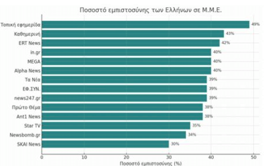 Σύμφωνα λοιπόν, με την ετήσια έρευνα του Ινστιτούτου Reuters, οι τοπικές εφημερίδες βρίσκονται στην ΠΡΩΤΗ θέση στον τοµέα της εµπιστοσύνης των πολιτών απέναντι σε όλες τις κατηγορίες Μ.Μ.Ε. της χώρας, µε ποσοστό εµπιστοσύνης 49%, αφήνοντας στη δεύτερη θέση την εφηµερίδα «Καθηµερινή» µε ποσοστό 43%, ενώ ακολουθούν η ΕΡΤ µε 42%, το in.gr, ο ALPHA και το MEGA µε 40%, τα Νέα, η Εφημερίδα των Συντακτών και το news247.grμε 39%.