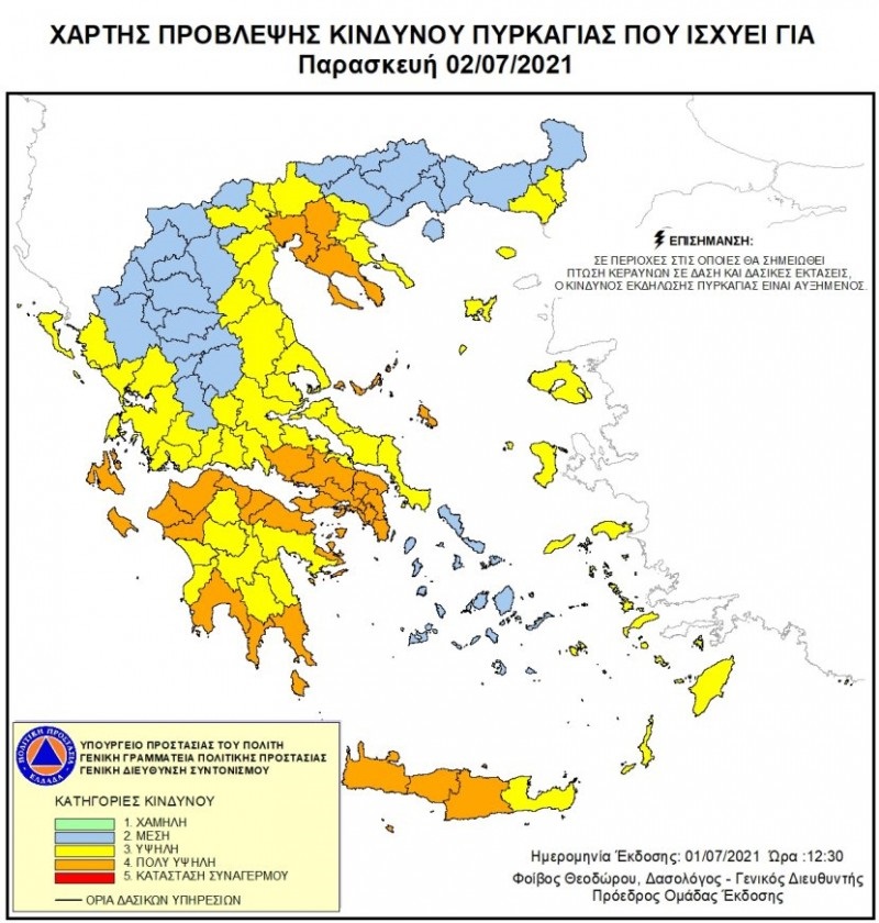 Για σήμερα, Παρασκευή, προβλέπεται πολύ υψηλός κίνδυνος πυρκαγιάς (κατηγορία κινδύνου 4) προβλέπεται σε Θεσσαλονίκη και Χαλκιδική και συγκεκριμένα στους δήμους Κασσάνδρας, Ν. Προποντίδας, Πολυγύρου, και Σιθωνίας και υψηλός κίνδυνος πυρκαγιάς (κατηγορία κινδύνου 3) στον Δήμο Αριστοτέλη και στη Χερσόνησο Αγίου Όρους, σύμφωνα με τον από 01/07/2021 Ημερήσιο Χάρτη Πρόβλεψης Κινδύνου Πυρκαγιάς που εκδίδει η Γενική Γραμματεία Πολιτικής Προστασίας του Υπουργείου Προστασίας του Πολίτη (www.civilprotection.gr).