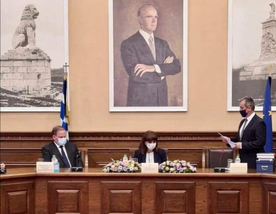 Βρισκόμαστε, κα Πρόεδρε, στην αίθουσα «ΚΩΝΣΤΑΝΤΙΝΟΣ ΚΑΡΑΜΑΝΛΗΣ» του Διοικητηρίου των Σερρών, προς τιμήν του τέκνου της σερραϊκής γης, του Εθνάρχη και διαμορφωτή της σύγχρονης ευρωπαϊκής Ελλάδας, που πάλεψε εναντίον του λαϊκισμού της εποχής του, προκειμένου να εξυπηρετήσει τα πάγια συμφέροντα του Έθνους.