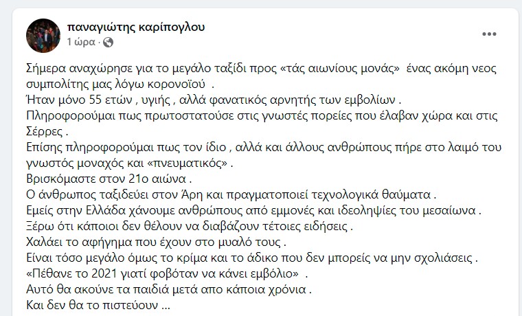 Σύμφωνα με τοκ κο Καρίπογλου έφυγε σήμερα από την ζωή 55χρονος αρνητής των εμβολίων, ο οποίος μάλιστα πρωτοστατούσε στις πορείες κατά του υποχρεωτικού εμβολιασμού