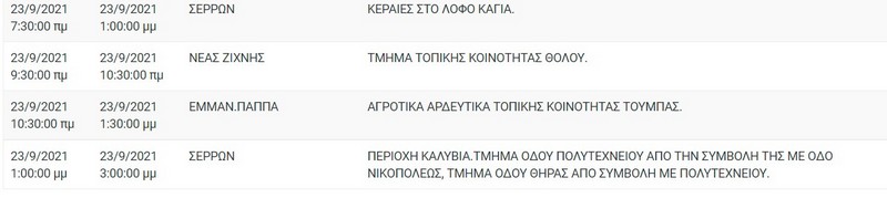 Από τον ΔΕΔΔΗΕ ανακοινώνεται ότι την Πέμπτη 23 Σεπτεμβρίου θα σημειωθούν διακοπές ρεύματος σε χωριά του νομού Σερρών στους δήμους Σερρών, Εμμ. Παππά και Νέας Ζίχνης
