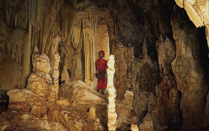 Ο κος Καρτάλης περιγράφει τι μπορούμε να δούμε στο πανέμορφο σπήλαιο, όπου η θερμοκρασία είναι σταθερή στους 18 βαθμούς
