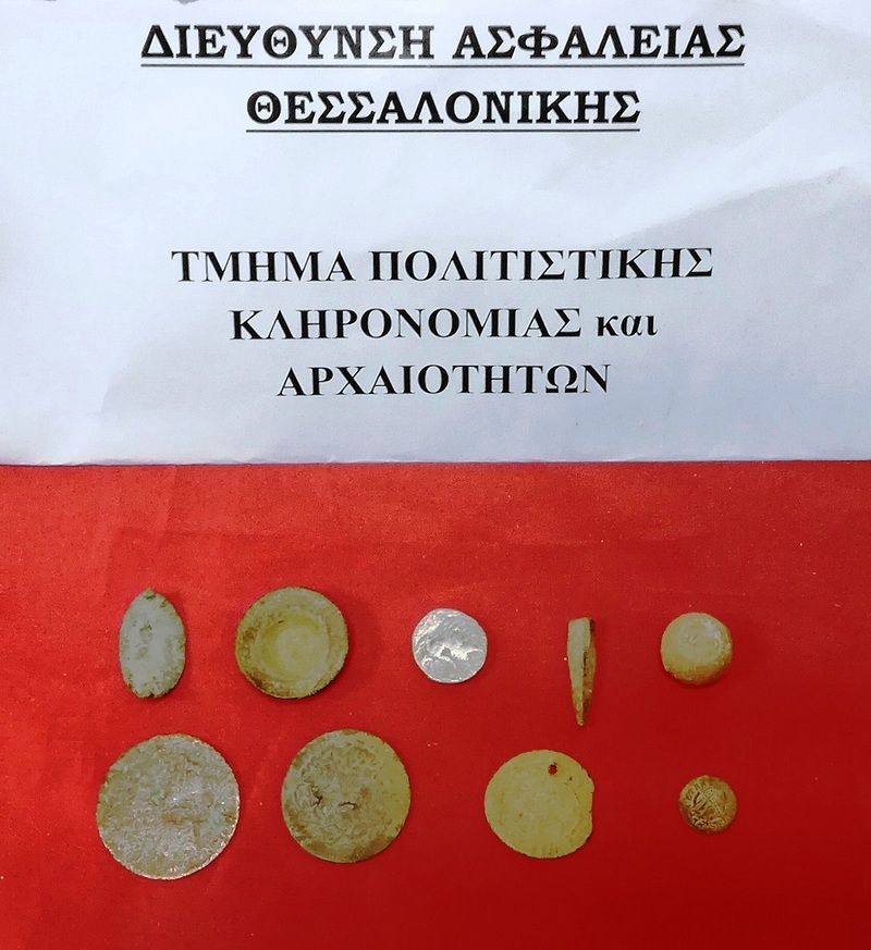 • πέντε χάλκινα και αργυρά νομίσματα, μία αιχμή βέλους και τρία χάλκινα αντικείμενα τα οποία, σύμφωνα με αρχαιολόγο της Εφορείας Αρχαιοτήτων Σερρών, εμπίπτουν στις προστατευτικές διατάξεις του Νόμου «Για την προστασία των Αρχαιοτήτων και εν γένει της Πολιτιστικής Κληρονομιάς»,