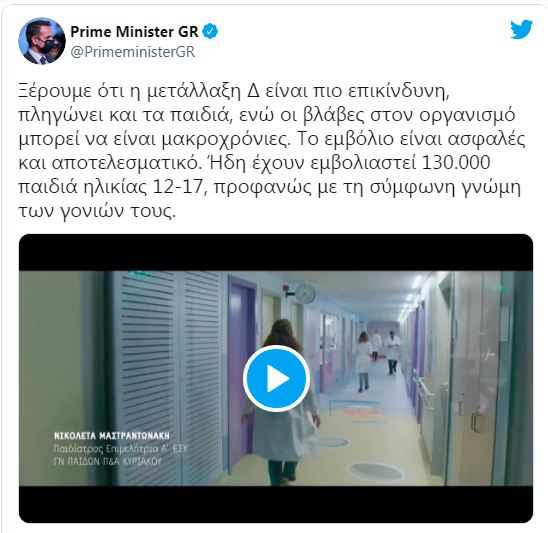 Σποτ για τον εμβολιασμό των νέων άνω των 12 ετών ανήρτησε ο Μητσοτάκης: «Η μετάλλαξη Δ πληγώνει και τα παιδιά»