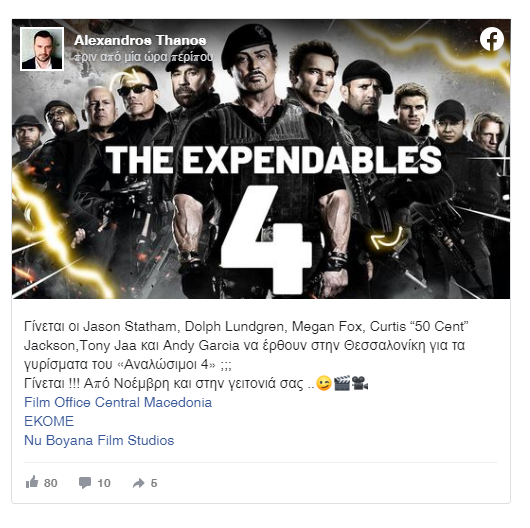 Όπως ανακοίνωσε μέσω facebook o τομεάρχης Τουρισμού της Περιφέρειας Κεντρικής Μακεδονίας, Αλέξανδρος Θάνος στην πόλη θα βρεθούν για τις ανάγκες των γυρισμάτων οι Jason Statham, Dolph Lundgren, Megan Fox, Curtis “50 Cent” Jackson,Tony Jaa και Andy Garcia!