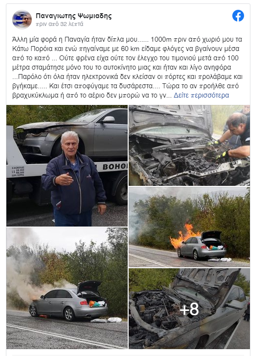 “Άλλη μία φορά η Παναγία ήταν δίπλα μου…… 1000m πριν από χωριό μου τα Κάτω Πορόια και ενώ πηγαίναμε με 60 km είδαμε φλόγες να βγαίνουν μέσα από το καπό … Ούτε φρένα είχα ούτε τον έλεγχο του τιμονιού μετά από 100 μέτρα σταμάτησε μόνο του το αυτοκίνητο μιας και ήταν και λίγο ανηφόρα …Παρόλο ότι όλα ήταν ηλεκτρονικά δεν κλείσαν οι πόρτες και προλάβαμε και βγήκαμε….. Και έτσι αποφύγαμε τα δυσάρεστα…. Τώρα το αν προήλθε από βραχυκύκλωμα ή από το αέριο δεν μπορώ να το γνωρίζω…ΚΤΕΟ είχα περάσει πριν 5 μέρες…Το ευτύχημα είναι ότι δεν ήμασταν σε κατοικημένη περιοχή η σε δρόμο με μεγαλύτερη κυκλοφορία…. Άμεση η επέμβαση της πυροσβεστικής τους οποίους ευχαριστώ…… Το αυτοκίνητο φυσικά καταστράφηκε……. Και εγώ και ο Χρήστος και ο Παναγιώτης είμαστε όλοι καλά….Ευχαριστώ όλους και όλες για το ενδιαφέρον σας”