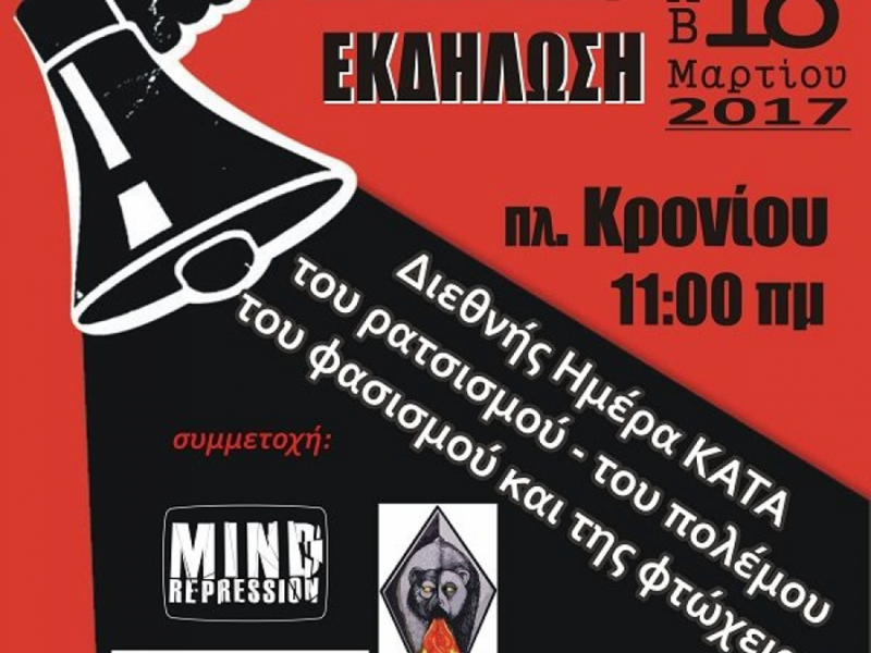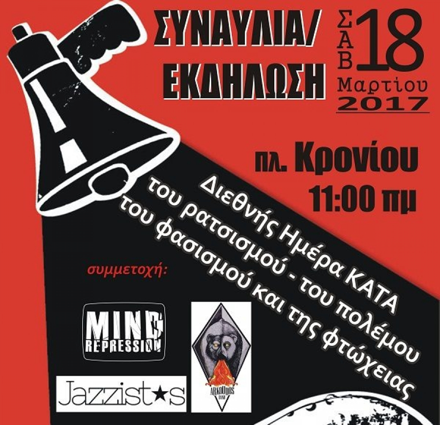 το Σάββατο 18 Μαρτίου, στις 11 το πρωί, στην πλατεία Κρονίου η Επιτροπή Αλληλεγγύης Σερρών για τους Πρόσφυγες με αφορμή τη διεθνής ημέρα δράσης κατά του ρατσισμού, του πολέμου, του φασισμού και της φτώχειας. Θεωρώντας ότι ένα χρόνο μετά την εφαρμογή της συμφωνίας ΕΕ – Τουρκίας, «τα σύνορα παραμένουν κλειστά για τους ανθρώπους που δραπετεύουν από τον πόλεμο και την εξαθλίωση, προκειμένου να σώσουν τη ζωή τους», τα μέλη της επιτροπής εκφράζουν την αντίθεσή τους διεκδικώντας: να ανοίξουν τα σύνορα σε πολιτικούς και οικονομικούς πρόσφυγες, ελεύθερη και ασφαλή μετακίνηση, να σταματήσουν ο εγκλωβισμός, οι επαναπροωθήσεις και οι απελάσεις, να κλείσουν τα στρατόπεδα και να φιλοξενηθούν αξιοπρεπώς οι πρόσφυγες μέσα στον οικιστικό ιστό.
