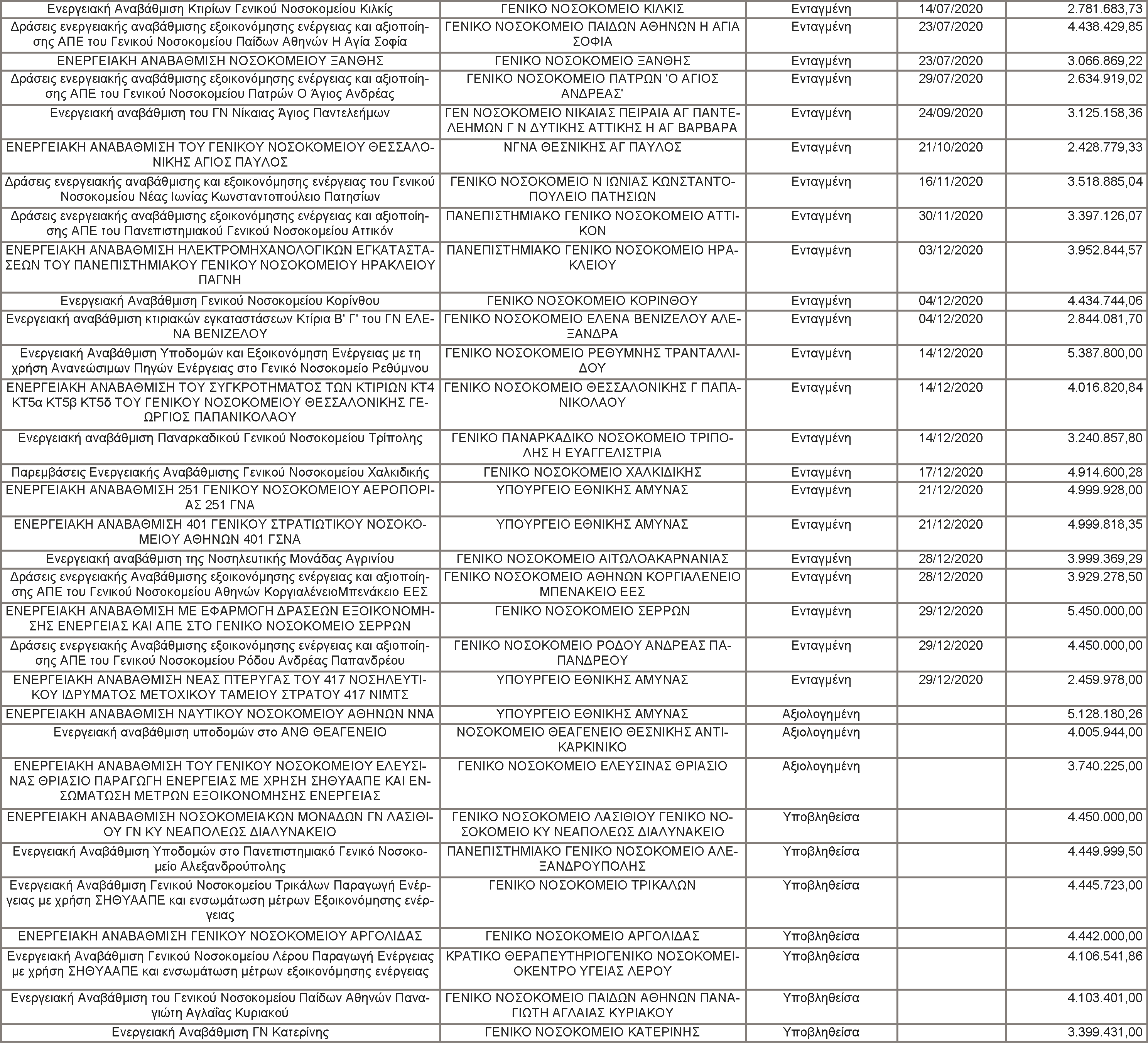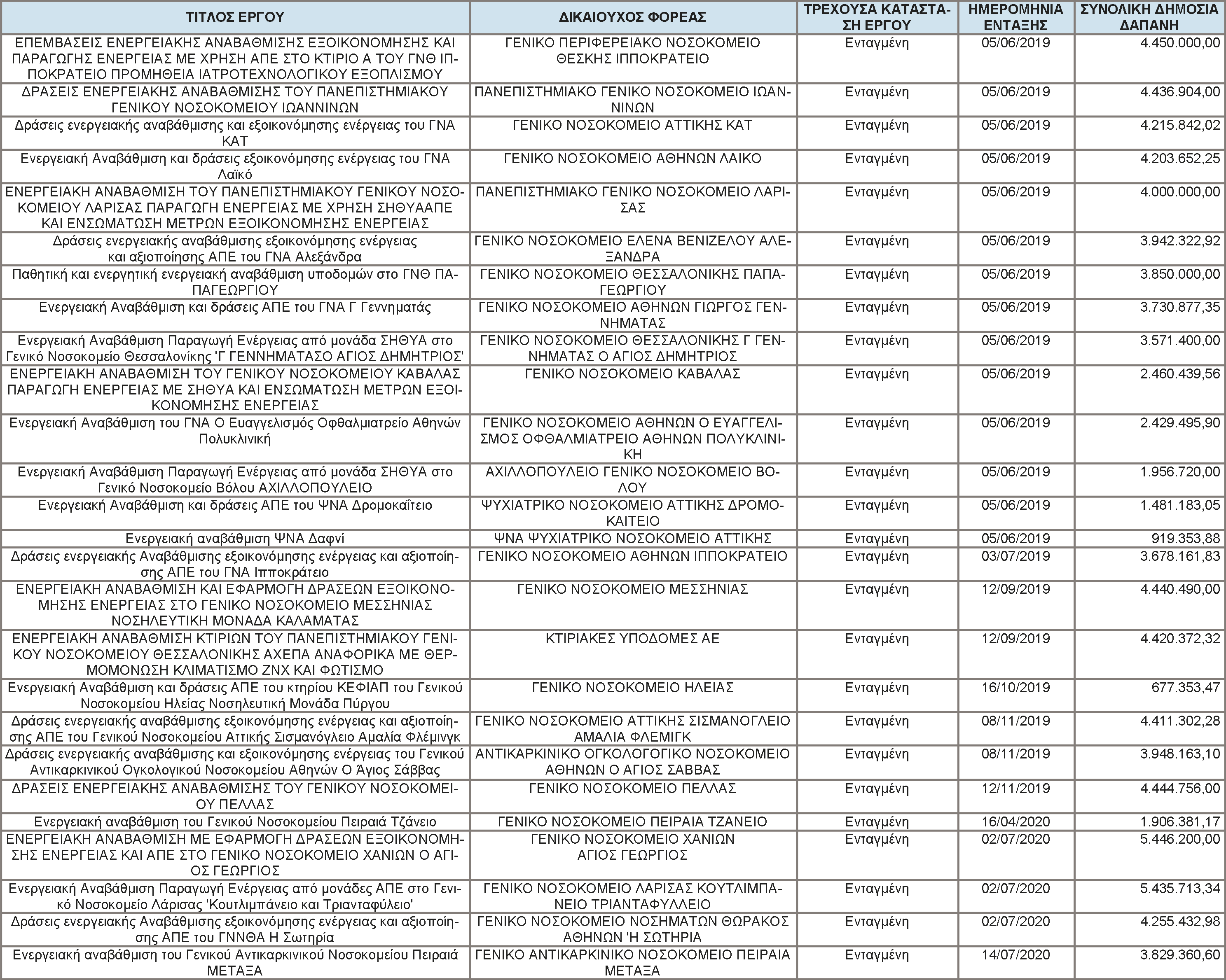 Η euractiv.gr αποκαλύπτει αποκλειστικά τη συνολική λίστα των εγκεκριμένων και υπό έγκριση επενδύσεων ενεργειακής εξοικονόμησης στα νοσοκομεία όλης της χώρας από το ΕΠ ΥΜΕΠΕΡΑΑ, όπου θα δείτε μεγάλα και γνωστά νοσοκομεία και το σύνολο των πόρων που αφιερώνονται σε καθένα από αυτά: