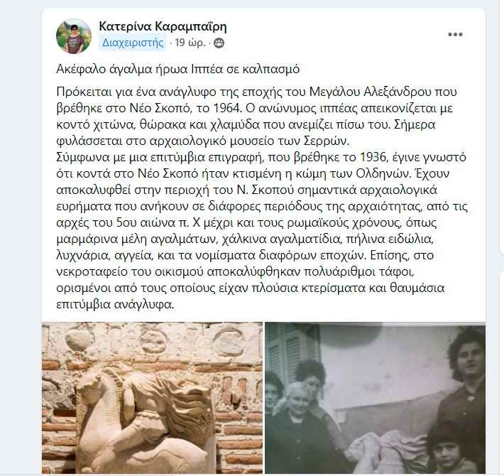 Πρόκειται για ένα ανάγλυφο της εποχής του Μεγάλου Αλεξάνδρου που βρέθηκε στο Νέο Σκοπό, το 1964. Ο ανώνυμος ιππέας απεικονίζεται με κοντό χιτώνα, θώρακα και χλαμύδα που ανεμίζει πίσω του, όπως μας ενημερώνει η σελίδα ΝΕΟΣ ΣΚΟΠΟΣ, ΣΕΡΡΕΣ