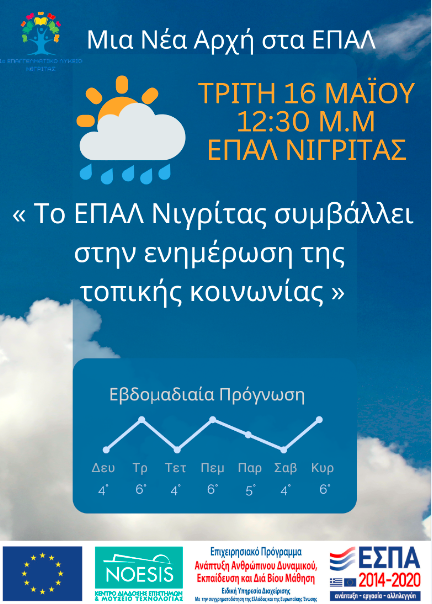 Το ΕΠΑΛ Νιγρίτας απευθύνει πρόσκληση ώστε να παρευρεθείτε στην εκδήλωση Διάχυσης των αποτελεσμάτων του προγράμματος ” Μια Νέα Αρχή στα ΕΠΑΛ¨με θέμα ‘έργου: “Το ΕΠΑΛ Νιγρίτας συμβάλει στην ενημέρωση της τοπικής κοινωνίας” που θα πραγματοποιηθεί την Τρίτη 16 Μαΐου ώρα 12:30 στον χώρο του ΕΠΑΛ Νιγρίτας.