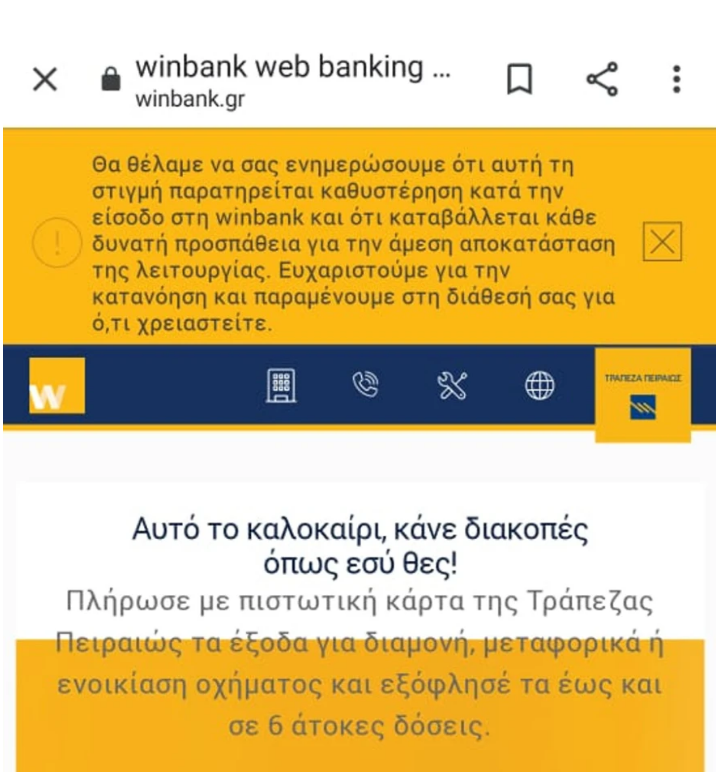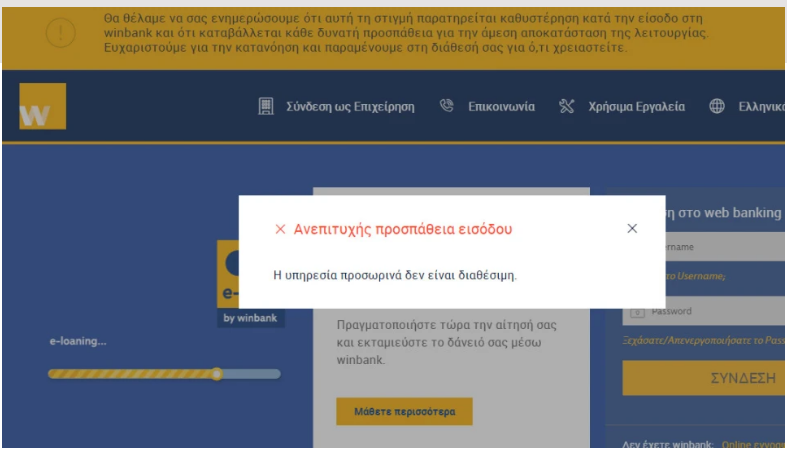 Το μήνυμα της τράπεζας στις ηλεκτρνικές συναλλαγές μέσω Winbank: «Θα θέλαμε να σας ενημερώσουμε ότι αυτή τη στιγμή παρατηρείται καθυστέρηση κατά την είσοδο στη winbank και ότι καταβάλλεται κάθε δυνατή προσπάθεια για την άμεση αποκατάσταση της λειτουργίας. Ευχαριστούμε για την κατανόηση και παραμένουμε στη διάθεσή σας για ό,τι χρειαστείτε». πηγή: prothema.gr