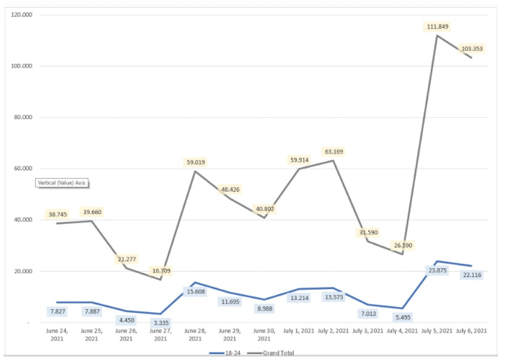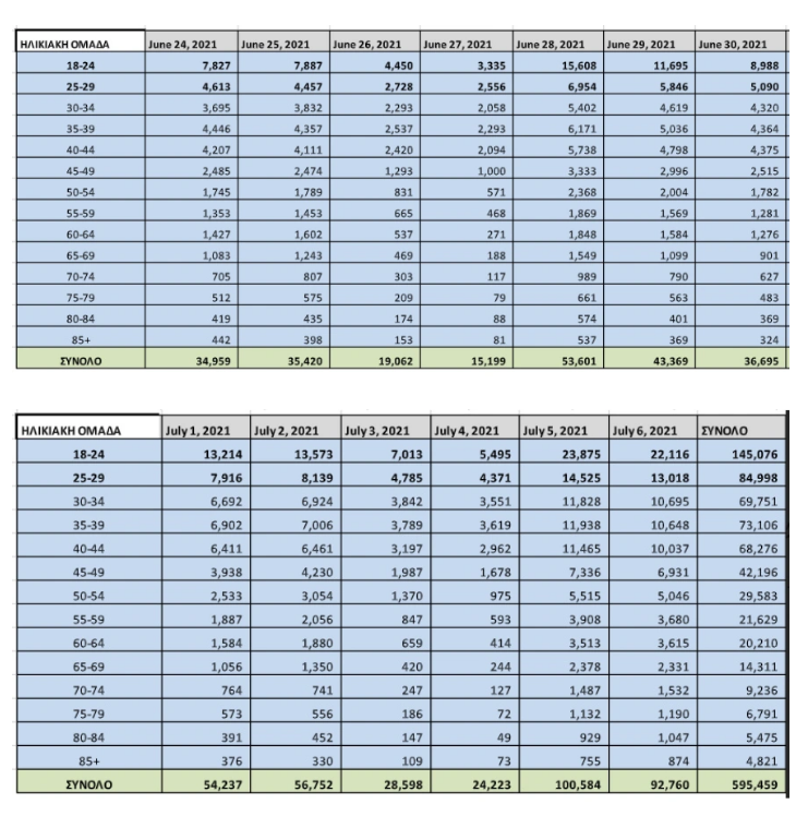 Τις δύο τελευταίες ημέρες, Δευτέρα 5 και Τρίτη 6 Ιουλίου, ο αριθμός των ραντεβού που κλείστηκαν σχεδόν τριπλασιάστηκε σε σχέση με τις προηγούμενες μέρες, ενώ τα περισσότερα ραντεβού κλείστηκαν στις ηλικίες 18-24 και 25-29. Αρκετά ήταν τα ραντεβού που κλείστηκαν επίσης και στις ηλικίες από 30 έως 44.