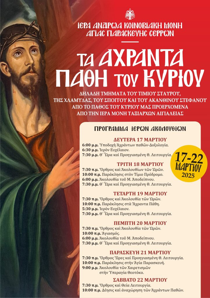 Η Ιερά Μονή Αγίας Παρασκευής Σερρών της Ιεράς Μητροπόλεως Σερρών και Νιγρίτης υποδέχεται με ευλάβεια τα Άχραντα Πάθη του Χριστού, μεταξύ αυτών τμήματα του Τιμίου Σταυρού, της λαβίδας, του σπόγγου και του ακανθίνου στεφάνου, τα οποία προέρχονται από την Ιερά Μονή Ταξιαρχών Αιγιαλείας.