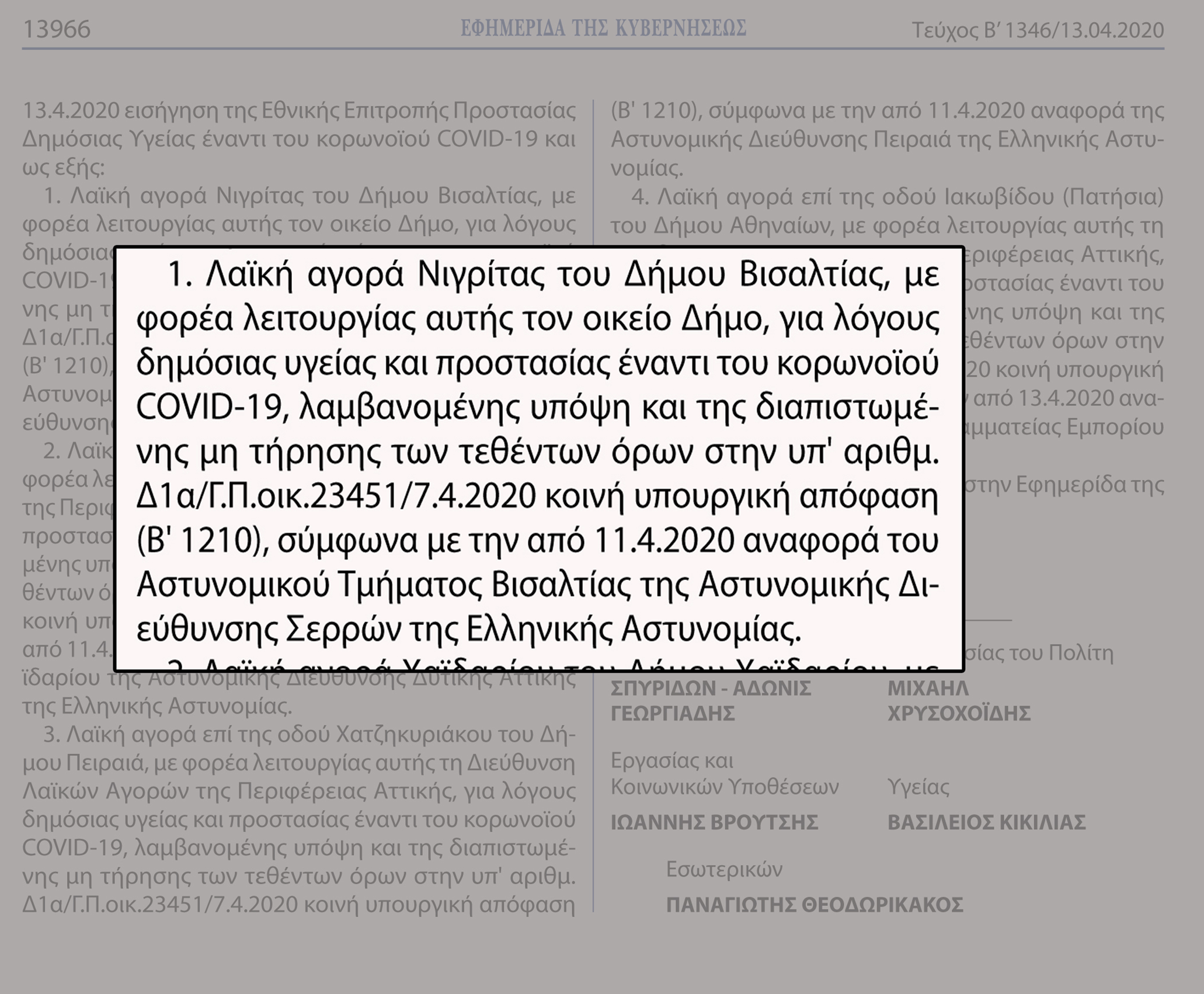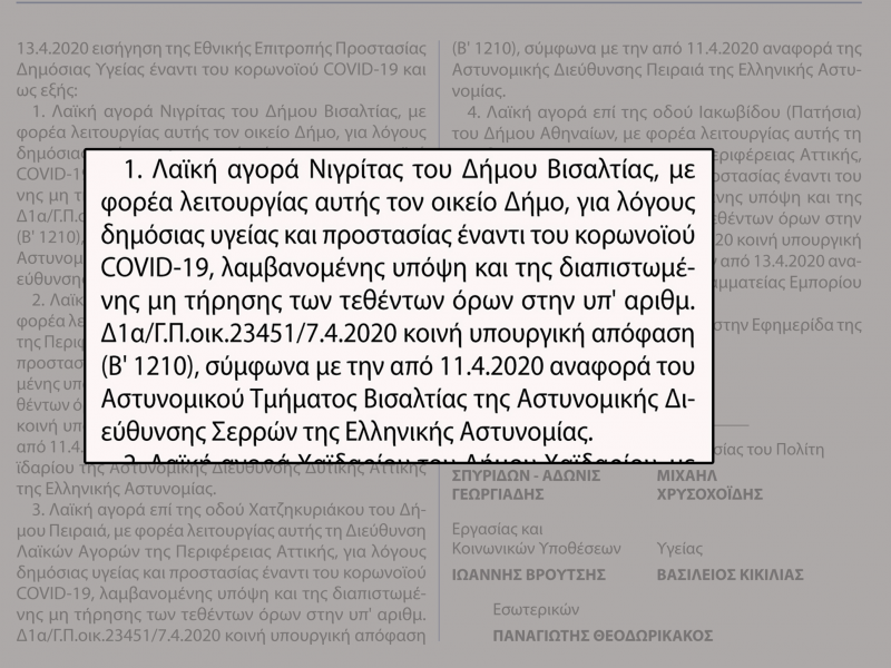 Η παραπάνω απόφαση των Υπουργών Ανάπτυξης και Επενδύσεων, Προστασίας του Πολίτη, Εργασίας και Κοινωνικών Υποθέσεων, Υγείας και Εσωτερικών δημοσιεύτηκε στην Εφημερίδα της Κυβερνήσεως με Αρ. Φύλλου 1346 και αφορά στο σύνολο την αναστολή λειτουργίας τεσσάρων λαϊκών αγορών σε ολόκληρη τη χώρα (Νιγρίτας, Χαϊδαρίου, Πειραιά, Πατησίων).
