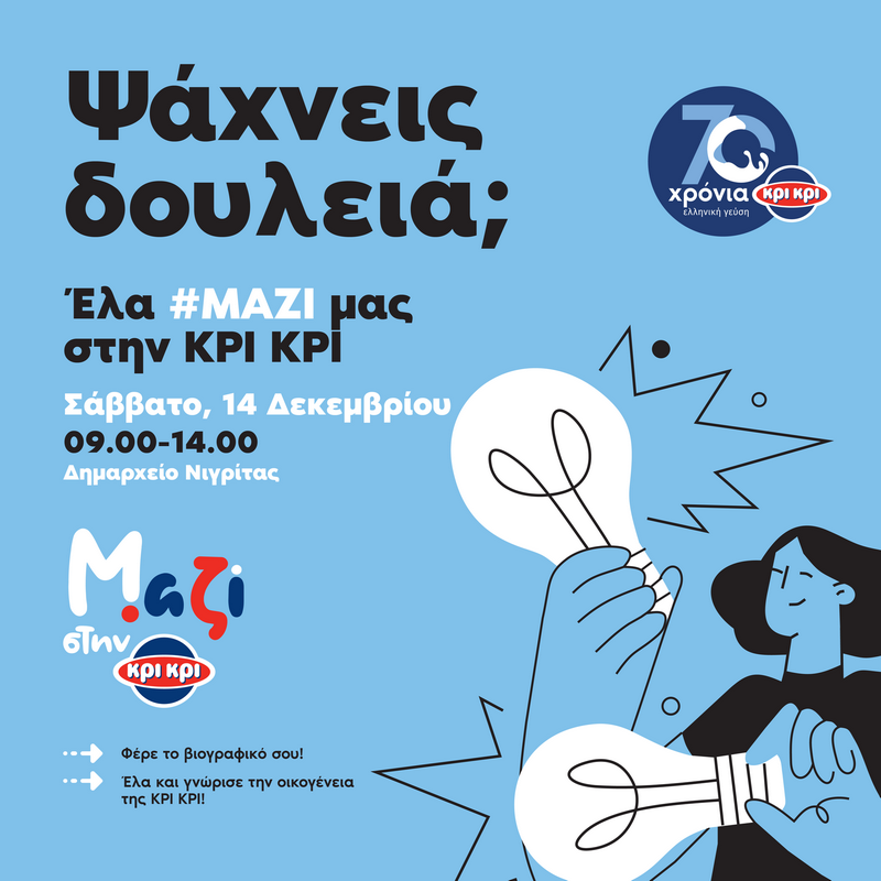 Η ΚΡΙ ΚΡΙ, η κορυφαία Σερραϊκή γαλακτοβιομηχανία, ΜΑΖΙ με το Δήμος Βισαλτίας διοργανώνουν για πρώτη φορά την Ημέρα Καριέρας στη Νιγρίτα, με στόχο τη στήριξη της τοπικής απασχόλησης.
