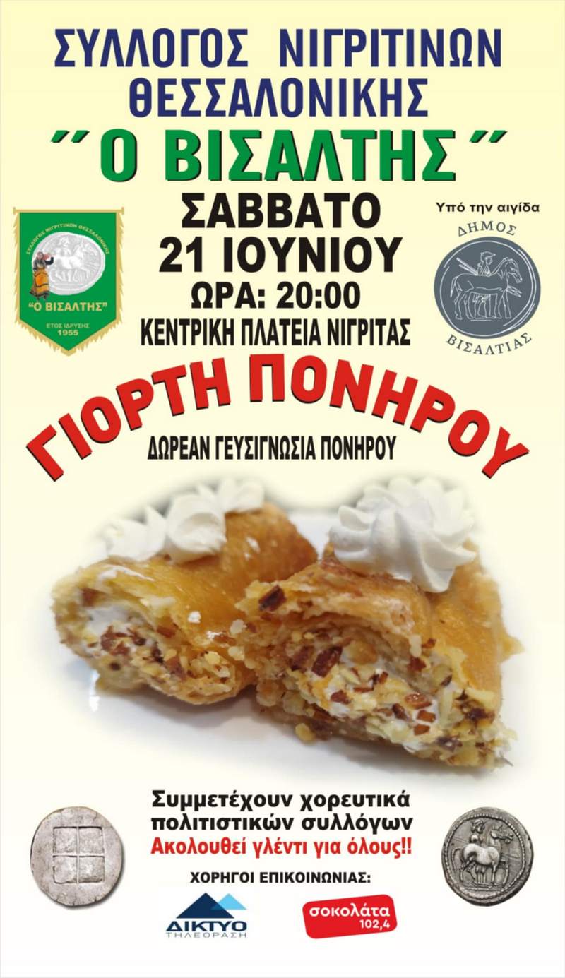 Ο Σύλλογος Νιγριτινών «Ο Βισάλτης» σας προσκαλεί στη 1η Γιορτή Πονηρού, του παραδοσιακού γλυκού της Νιγρίτας που θα πραγματοποιηθεί το Σάββατο 21 Ιουνίου 2025 στην κεντρική πλατεία
