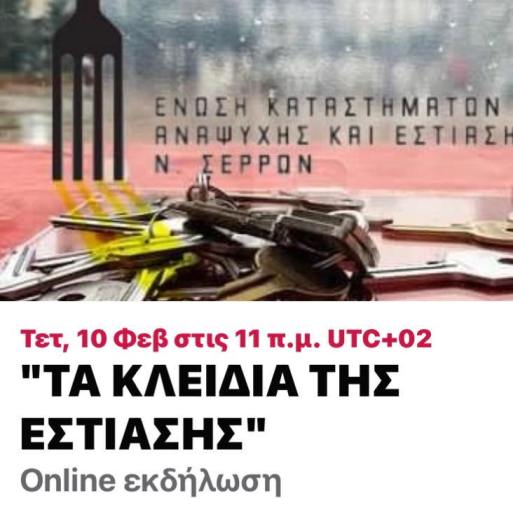 Η ΕΝΩΣΗ ΕΣΤΙΑΤΟΡΩΝ & ΣΥΝΑΦΩΝ ΕΠΑΓΓΕΛΜΑΤΩΝ ΝΟΜΟΥ ΣΕΡΡΩΝ γνωστοποιεί ότι την Τετάρτη 10 Φεβρουαρίου 2021, από τις 11.00 το πρωί μέχρι και τις 4.00 το απόγευμα, μπροστά από το κτήριο του Διοικητηρίου των Σερρών (πρώην Νομαρχία) θα συλλέγονται τα κλειδιά των επιχειρήσεων και οι συνάδελφοι θα υπογράφουν τη σχετική «Δήλωση πρώην επαγγελματία Εστίασης». Τα κλειδιά και η δήλωση θα μπαίνουν σε ένα φάκελο προς την Ομοσπονδία. Αντιπροσωπεία 99 συναδέλφων και ο πρόεδρος κάνοντας πορεία διαμαρτυρίας θα παραδώσουν…