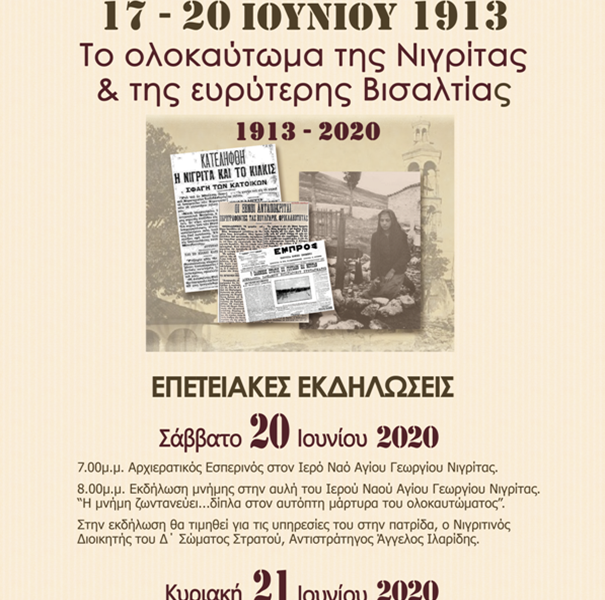 Σας καλούμε να τιμήσετε με την παρουσία σας τις εκδηλώσεις μνήμης που διοργανώνει ο Δήμος Βισαλτίας και ο Ιερός Ναός Αγίου Γεωργίου Νιγρίτας με την ευκαιρία της 107ης επετείου του ολοκαυτώματος της πόλης της Νιγρίτας και της ευρύτερης Βισαλτίας, που συνέβη κατά τον Β΄ Βαλκανικό πόλεμο, από 17 έως 20 Ιουνίου 1913. Οι εκδηλώσεις θα πραγματοποιηθούν το διήμερο 20 & 21 Ιουνίου 2020 στον Ιερό Ναό Αγίου Γεωργίου Νιγρίτας.   ΠΡΟΓΡΑΜΜΑ ΕΠΕΤΕΙΑΚΩΝ ΕΚΔΗΛΩΣΕΩΝ Σάββατο 20 Ιουνίου 2020…